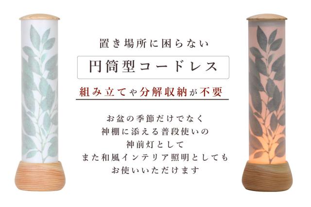 コードレス、アルカリ単四電池2本を使用します。どこにでも置けるコンパクトなサイズの中でも、人気の円筒型をお探しの方にお勧めです。 明かりを灯さなくても和モダンの趣き。台座と上蓋は国産の桧無垢材、木の風合いはいっそう優しく、豪華に。 お仏壇周り、和室、洋室、フローリングのお部屋を問わずマッチするデザイン。組み立て不要の手軽さと収納便利なサイズ感となっています。ご自宅にもちろん、お盆用プレゼント・お供えとしても最適。 |