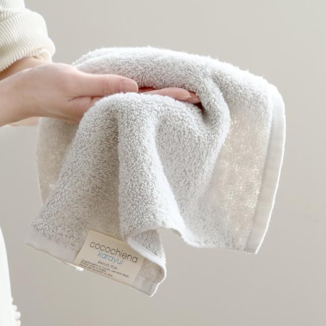 「洗うほどに膨らむタオル」をテーマに開発されたスイッチパイルは、洗ってもパイルがへたりにくく、膨らみのある風合いを持続させる製造技術です。タオルは毎日使っていくうちに固くゴワゴワになってふんわり感が失っていきますが、ココチエナシリーズのタオルは洗う度にふっくら弾力が増し、スーッと水をしっかり吸水してくれます。日常使いはもちろん、来客用としてや、贈り物としても喜ばれます。