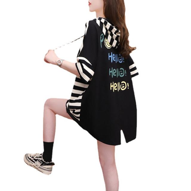 【キーワード】カットソー Tシャツ レディース トップス 半袖 配色 体型カバー フード付き パーカー ティーシャツ カジュアル 夏 柔らかい質感 ゆったり 大人 カジュアル