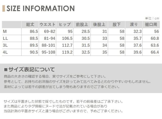 4L:総丈90.5 ウエスト95-108 ヒップ119.2 前股上32.5 後股上35 股下58 渡り幅39.6 裾口周66.4