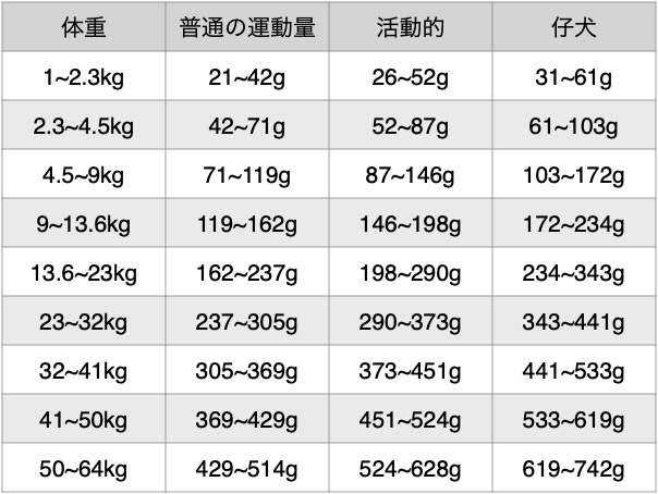・給与量は犬種、体質、生活環境、活動量、年齢、季節や気候などにより大きく違ってきます。上記給与目安量を目安として理想的な体重を維持できる最適な量に調整してください。