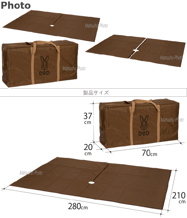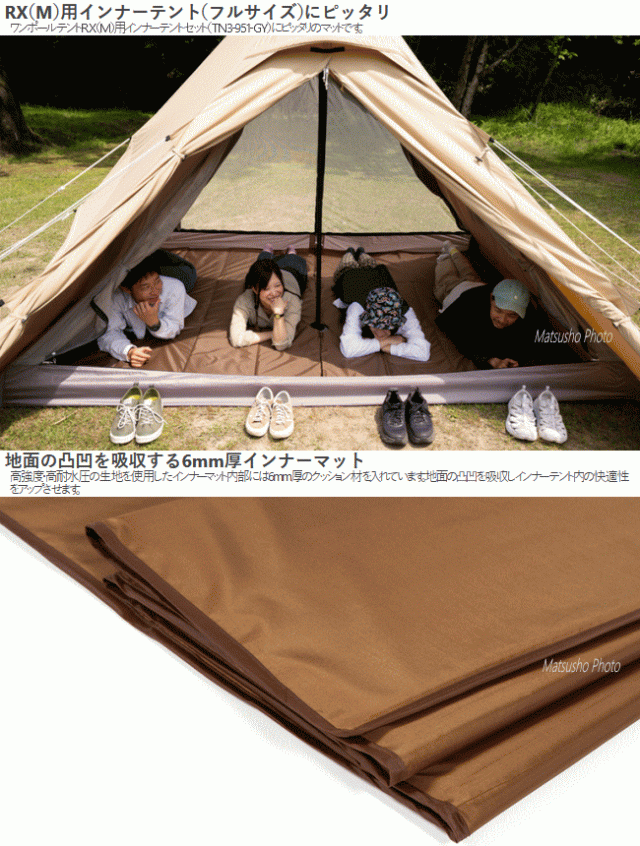 テント内をさらに快適な空間にするインナーマット。ワンポールテントRX(M)用インナーテントセット(TN3-951-GY)にピッタリのマットです。高強度・高耐水圧の生地を使用したインナーマット内部には6mm厚のクッション材を入れています。地面の凸凹を吸収しインナーテント内の快適性をアップさせます。また断熱効果もあり地面からの冷えを軽減します。汚れの防止や持ち運びに役立つキャリーバッグが付属します。■カラー:ブラウン■サイズ約W280×D210cm■収納サイズ約W70×D20×H37cm■重量(付属品含む)約2.4kg■材質:210Dポリエステル(PUコーティング)、ポリエチレン■セット内容:マット、キャリーバッグ