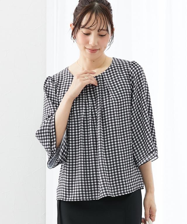 ■素材:オフィス使いにぴったりなジョーゼット生地を使用し、カットソー素材の裏地を見ごろにつけているので下着が透けにくく安心感のあるアイテム