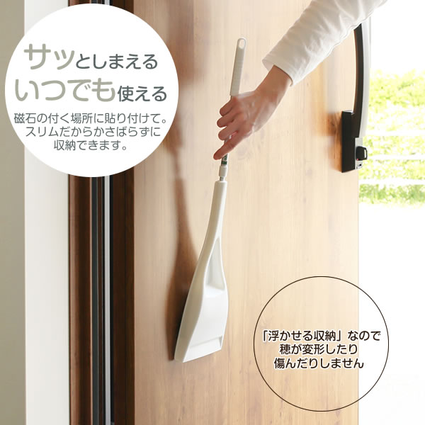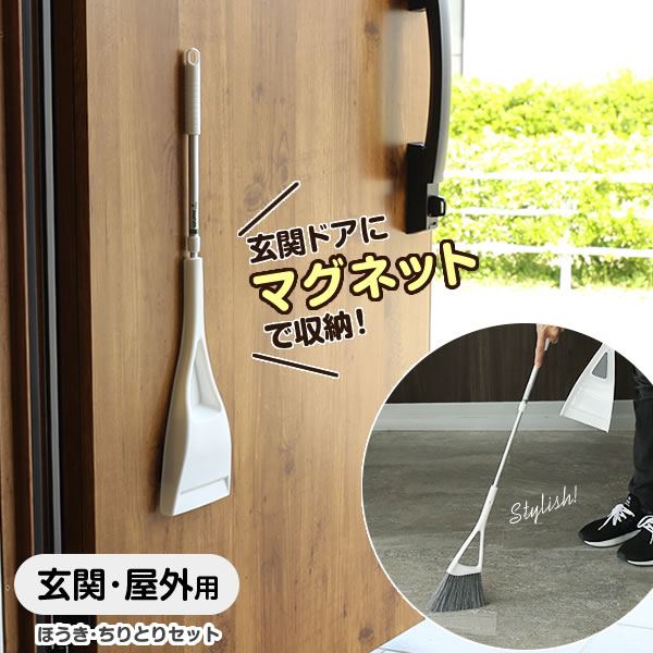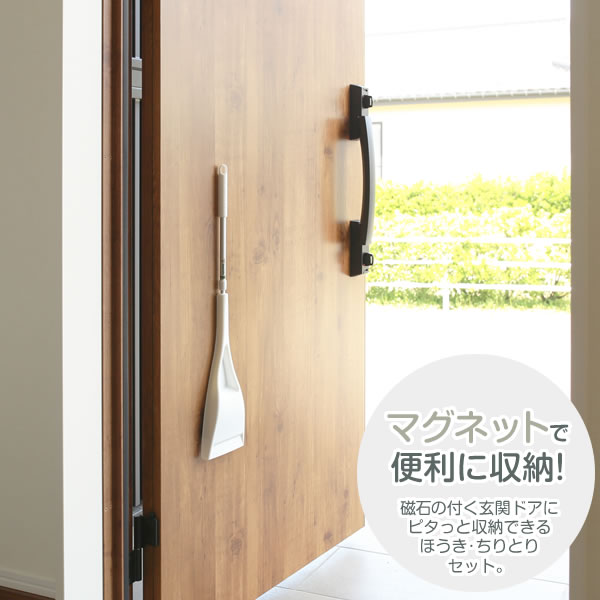 マグネットの付く玄関ドアにピタっと貼り付けて収納できる、玄関ほうき・ちりとりセット。