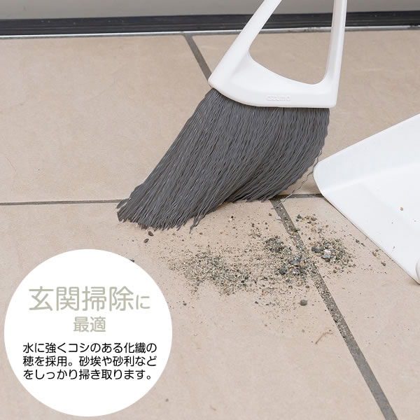 玄関周りの掃き掃除に最適な穂水に強く、コシのある化繊の穂を採用。砂埃や砂利などをしっかり掃き取ります。