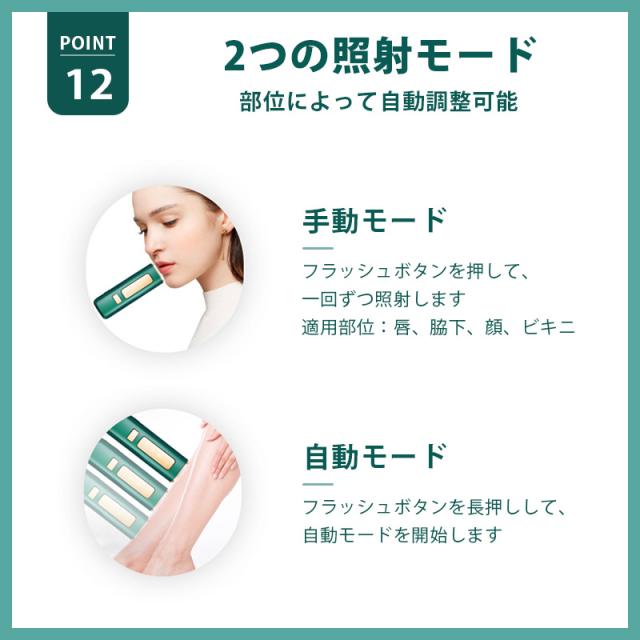 自動連射モードと手動モード二つモードがあります。スマートな自動認知センサーが搭載されるので発光口が自分の皮膚と十分に接触しているかどうかを判断でき、使用の安全性を確保しています。初心者にも気楽使えます。