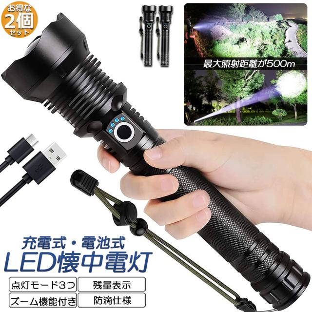 懐中電灯 ledライト XHP70 ハンディライト 2個セット 強力 防水 USB充電式 電池式 LCD残量表示 ズーム機能 3モード調光 Type-C充電式 ledライト フラッシュライト led 明るい ハンディライト 登山用品 防災 停電対策 夜釣り