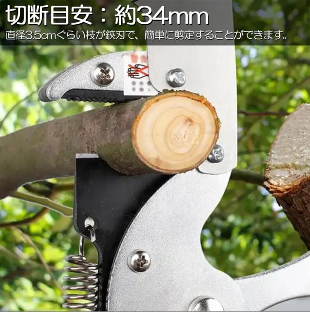 ハサミ切り:直径約3.4cmぐらい枝が鋏刃で、簡単に剪定することができます。裾刃付き:太枝を鋏で切れない場合では、裾刃で切ります。