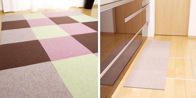 | プレイマットに 20枚を長方形になるように並べるとラグの代わにも使えるサイズ感です。お子様のプレイマットとしてもぴったりです。 | キッチンマットにも 4枚を横一列に並べるとキッチンマットとしてもお使い頂けます。 |