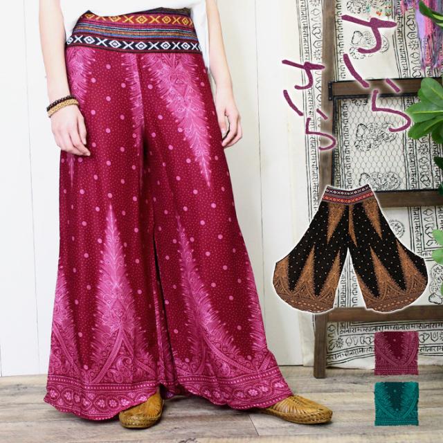 パンツ レディース さらさらレーヨン ウエストゲリ ピーコック柄変形ワイドパンツ 2025年春夏 【メール便OK】