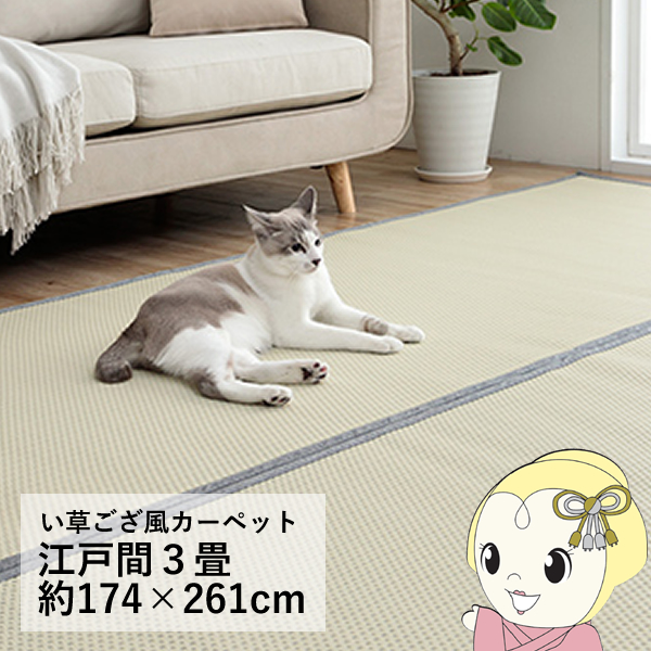両面使用できるリバーシブル仕様。 汚れに強い。 い草ござ風お手入れ簡単カーペット。 ■サイズ 江戸間3畳 約174×261cm ■カラー グレー ■組成 表地=ポリプロピレン100% ヘリ=ポリエステル100% ■原産国 日本 ■洗濯表示 水拭き・水洗い可能 ※ 畳のお部屋に上敷きとして使用する場合は市販の上敷き鋲との併用をおすすめします。 ※ 滑りやすい床等で使用する場合は市販の滑り止めシートとの併用をおすすめします。 ※ 掲載写真は表記サイズと異なる場合がございます。 ※写真はメーカー様のカタログ等から掲載させて頂いております。 実物の商品と写真の色が若干写真写り等により異なる場合がありますのでご注意くださいませ。 万が一の際でございましても返品はお受け致しかねます。 ※記載は商品仕様の一部です。仕様説明不足等の理由での返品はできません。特に適合等は必ずご確認ください。