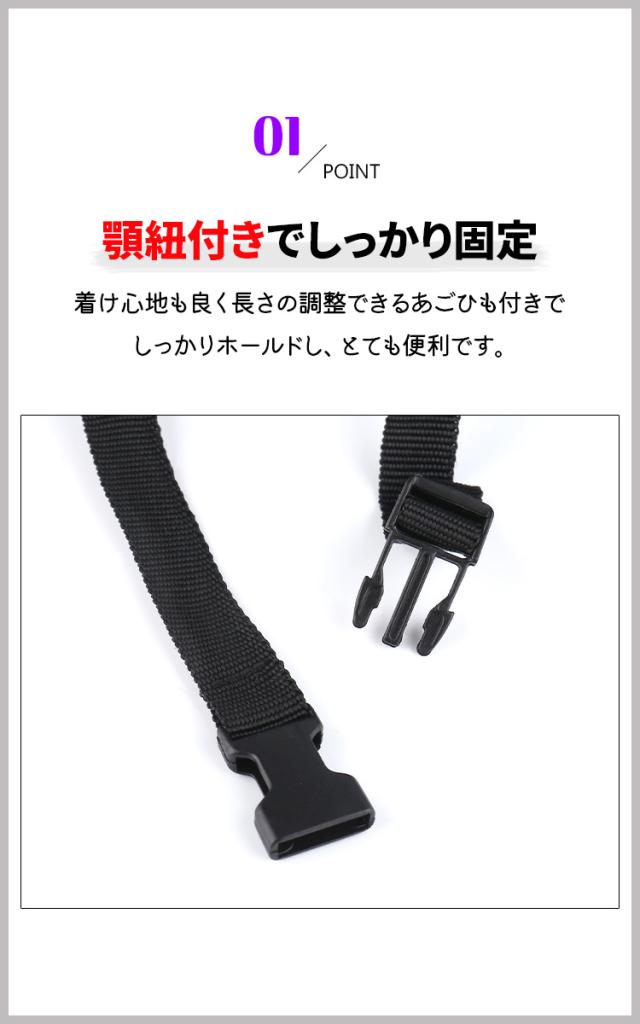 - 着け心地も良く長さの調整できるあごひも付きでしっかりホールドし、 とても便利です。