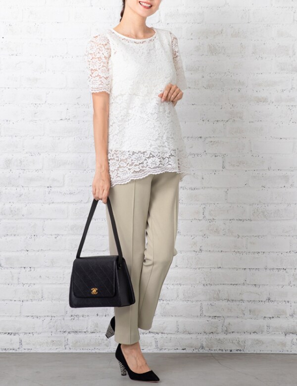 マットな質感と、上品な質感のカットジョーゼット素材でママのおしゃれを格上げしてくれるマタニティパンツ