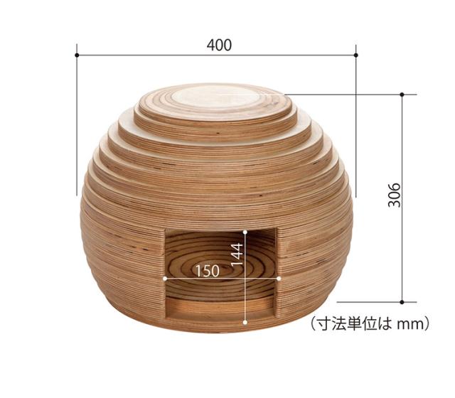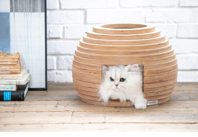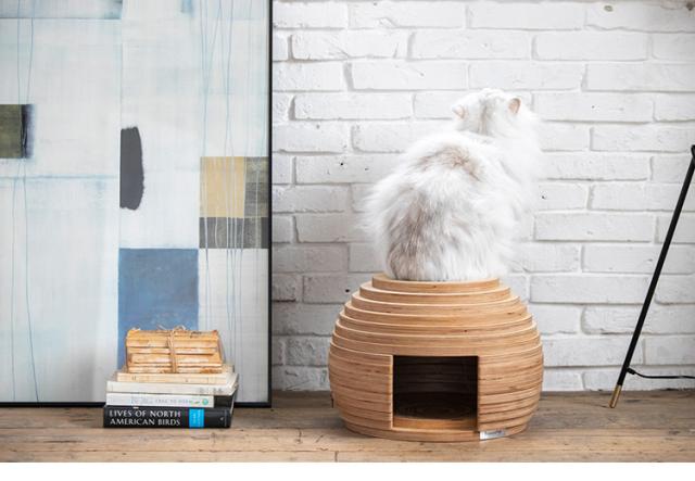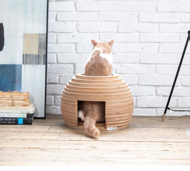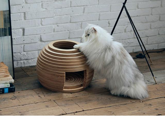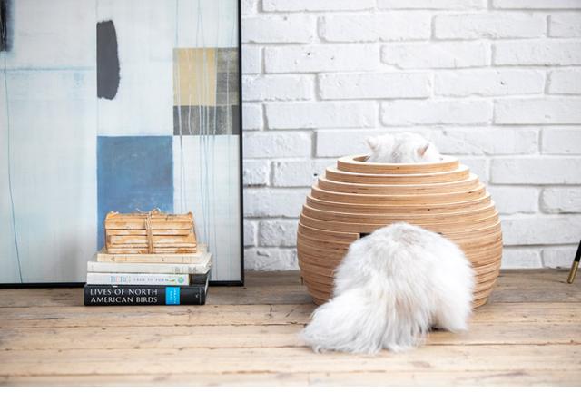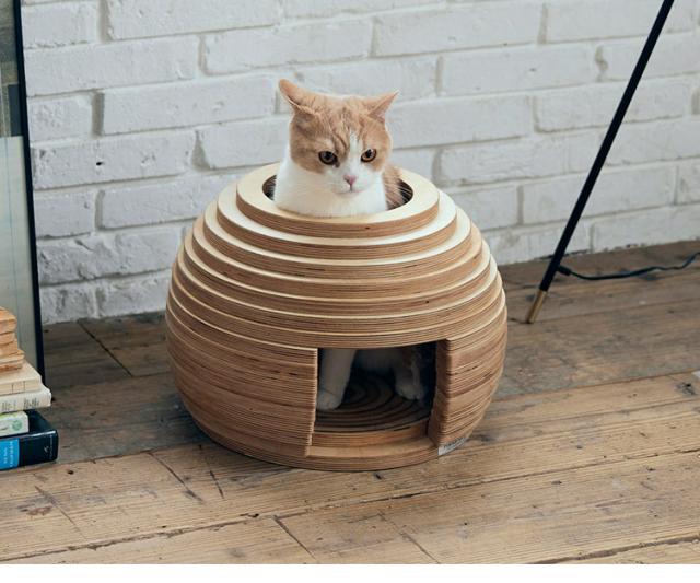 集成材を削りだしボール型にデザインした「ねこハウス」。頂点の板は取り外しが可能で、ねこが出入りしたり、顔をのぞかせたりできます。