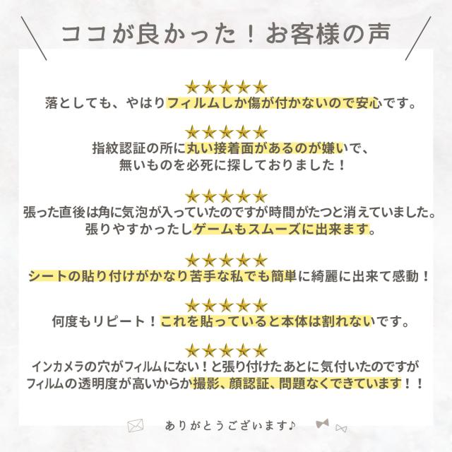 ※仕様注意点 グレードアップして厚さ0.18~0.2mmの仕様となっております。( タッチ感度 UP ) また、機種はフロントカメラまで保護できるようにカメラホール加工の無い仕様です。 撮影機能に影響はございません。Face ID 認証もお使いいただけます。 Galaxy本体を新品購入時に付属の保護シートはお剥がしください。 ※ガラスフィルムは画面保護を目的とした製品設計となり 指紋認証に対応しておりません。 指紋認証機能をメインにご使用をご検討の方には 別途販売のウレタンTPUフィルムを推奨しております。 ※ S23 Ultra は「曲面仕様」となっておりますので 湾曲エッジ部分ギリギリまで保護するよう設計されています。そのためスマートフォンケース ( 手帳型 ケース ジャケット型 ケース バンパー型 ケース Galaxy 純正 ケース )をはめると Galaxy 本体 ケース と ガラスフィルム が干渉する場合がございます。 |