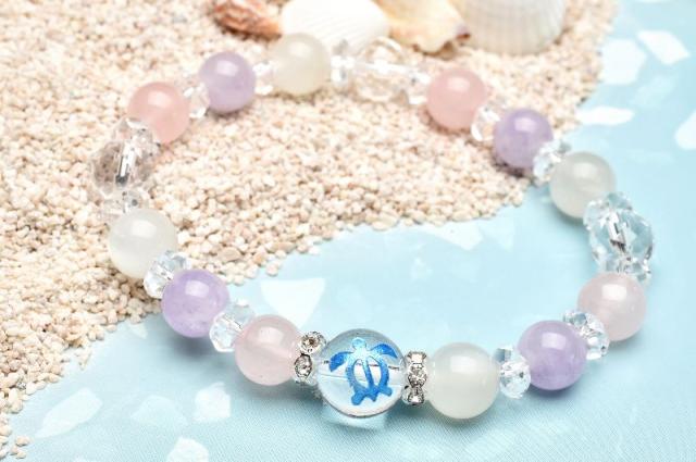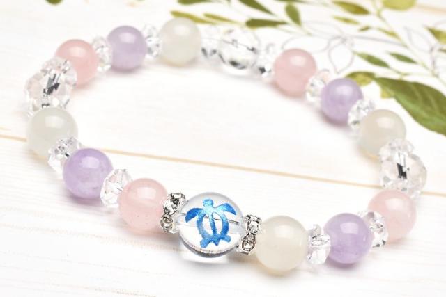 | 特徴・意味 | マダガスカル産ローズクォーツやラベンダーアメジスト、ムーンストーンを組み合わせ、ミルキーで可愛らしい印象のブレスに仕上げました。 ムーンストーンのシラーと64面カットの水晶がキラキラと輝き、お手元を美しく着飾ってくれるでしょう。 この組み合わせは縁結び・恋愛成就など恋愛に特化したお守りにおすすめです。 水晶に彫刻されているウミガメは、ハワイ語で【Honu(ホヌ)】と言い、 古くからウミガメは出会うと幸せが訪れる神聖な生き物と伝えられています。 「幸運を運んでくれる」「神様からの使い」として大切にされ、平和・幸運・長寿の象徴となっています。 身を守ってくれるお守りとして持つ人も多く、贈り物としても人気です。 材質 ▼ 水晶 ホヌ【ブルー彫】:10mm ムーンストーン:8mm ラベンダーアメジスト:8mm マダガスカル産ローズクォーツ:8mm 64面カット水晶:8mm 水晶ボタンカット:3x6mm 銀ロンデル(クリアー):6mm パワーストーンの中でも、女性から絶大な支持を得ているローズクォーツ。 誰から見ても「かわいい」「美しい」と感じられる石ではないでしょうか。 ローズクォーツは、クォーツ(石英)の変種でピンク色のものをいい、その美しいピンク色やローズ色から、和名を『紅石英』または『バラ石英』と呼ばれています。 同じく淡い色合いで女性に人気のあるラベンダーアメジストも同じクォーツ(石英)の変種です。 ムーンストーンは恋愛運に非常に強い石で、「恋人の石」「愛を伝える石」とも言われており、恋愛成就、永遠の愛、幸せな結婚、危険予知、感受性を豊かにしてくれる石とされています。 どれも恋愛運に特化した運気を持つパワーストーンのため、縁結びや恋愛成就を含めて、恋に特化した組み合わせだと言えます。 恋人との円満な生活や、幸せな結婚に向けてのお守りにピッタリです。 |