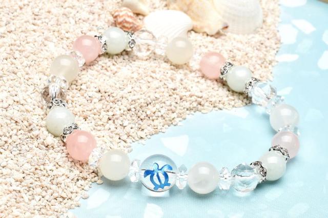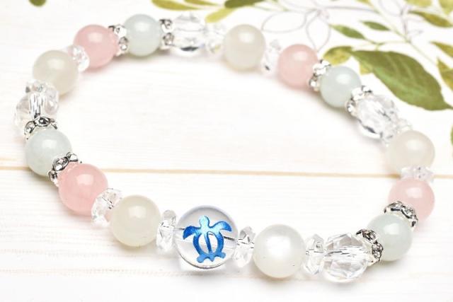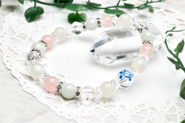 | 特徴・意味 | ミルキーで可愛らしい印象のマダガスカル産ローズクォーツや「恋人の石」「愛を伝える石」とも言われるムーンストーン、淡いグリーンカラーの翡翠(ヒスイ)を組み合わせ、華やかで可愛らしい印象のブレスに仕上げました。 スターカット水晶がキラキラと輝き、お手元を美しく着飾ってくれるでしょう。 この組み合わせは恋愛成就・目標達成などのお守りにおすすめです。 水晶に彫刻されているウミガメは、ハワイ語で【Honu(ホヌ)】と言い、 古くからウミガメは出会うと幸せが訪れる神聖な生き物と伝えられています。 「幸運を運んでくれる」「神様からの使い」として大切にされ、平和・幸運・長寿の象徴となっています。 身を守ってくれるお守りとして持つ人も多く、贈り物としても人気です。 材質 ▼ 水晶 ホヌ【ブルー彫】:10mm ムーンストーン:8mm マダガスカル産ローズクォーツ:8mm 水晶スターカット AA:8mm ビルマ翡翠(硬玉ジェダイト)【AA】:8mm 水晶ボタンカット:3x6mm 銀ロンデル(クリアー):6mm パワーストーンの中でも、女性から絶大な支持を得ているローズクォーツ。 誰から見ても「かわいい」「美しい」と感じられる石ではないでしょうか。 ローズクォーツは、クォーツ(石英)の変種でピンク色のものをいい、その美しいピンク色やローズ色から、和名を『紅石英』または『バラ石英』と呼ばれています。 ムーンストーンは恋愛運に非常に強い石で、「恋人の石」「愛を伝える石」とも言われており、恋愛成就、永遠の愛、幸せな結婚、危険予知、感受性を豊かにしてくれる石とされています。 翡翠は古来より「徳」を高めることで「成功と繁栄」をもたらす石とされ、現代でも仕事や恋愛など、あらゆる「目標」を成功へ導く手助けになってくれると言われています。 |