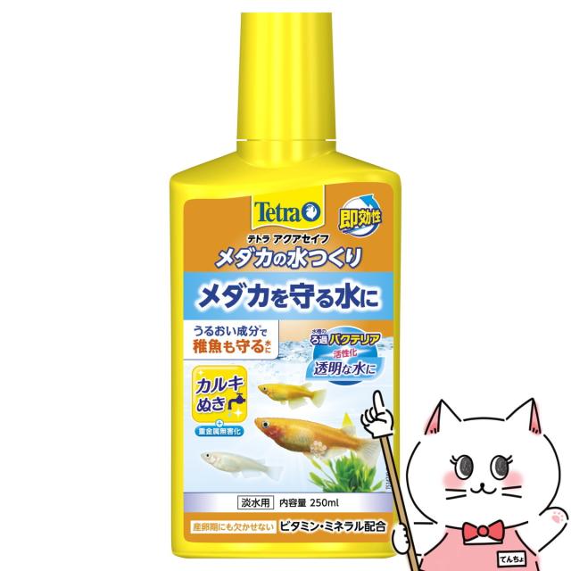 全ての大切なメダカと稚魚を守る、うるおい成分配合カルキ抜き入り粘膜保護剤。うるおい成分(強力保護コロイド)が体表を包み、魚の健康な粘膜・エラを守る水に調整します。水道水に含まれる有害なカルキ・クロラミン・重金属(銅・亜鉛・鉛・カドミウムなど)を無害化します。ミネラルを豊富に含み、水道水を自然環境水に近づけます。天然の海藻抽出成分が水槽のろ過バクテリアの定着を促し、透明でクリアな水を作ります。