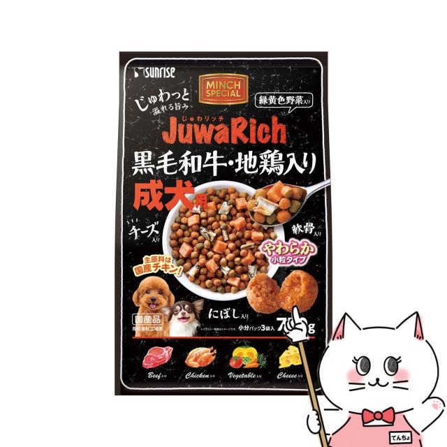 国産チキンを主原料に使用し、独自製法でじゅわっと溢れる旨みのやわらか小粒に仕上げ、圧倒的な美味しさを実現したフードです。国産ブランドの黒毛和牛を配合し、緑黄色野菜で食のバランスを整え、軟骨とにぼしをトッピングした彩り豊かなフードです。