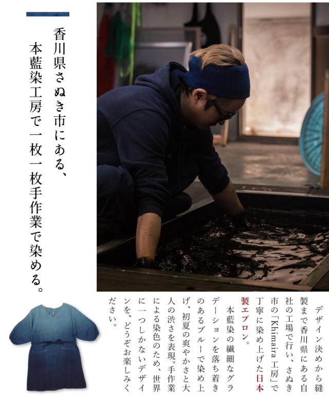 香川県にある自社工場でデザインから縫製まで行い、さぬき市津田町にある「khimaira工房」にて一枚一枚手作業で染められた、高品質な藍染かっぽうぎ。大好評のスタイリッシュ割烹着を夏仕様に改良し、美しい藍染のグラデーションで染め上げました。母の日や誕生日のプレゼントにおすすめです。