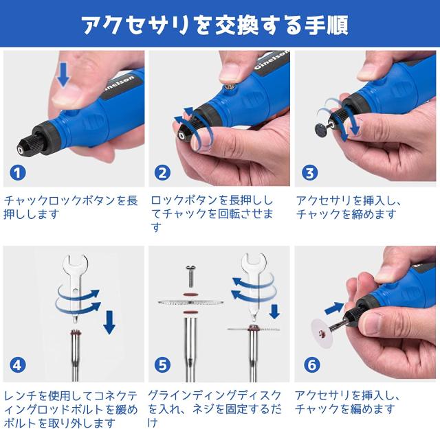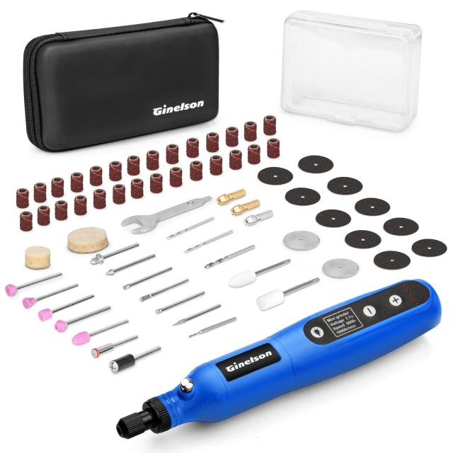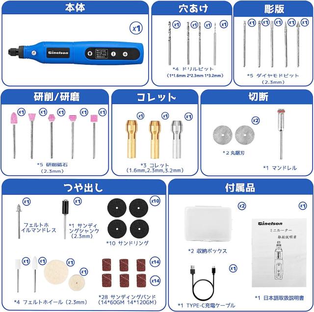 Ginelsonミニルーターのパッケージに64個のビットと2個収納箱があり、交換用のビットが多くあるので、よくビットの購入が不要です。今回は3丸鋸刃、2フェルトホイールとカットオフホイールを追加いたし、彫刻/穴あけ/研磨/切断/切削/つや出し/マニキュア/汚れ落としなどの作業はちゃんとでき、1in8以上はもっと幅広く対応できます。
