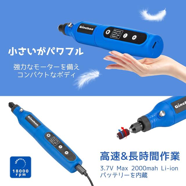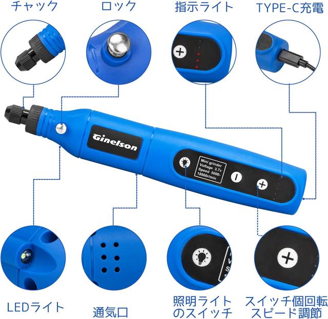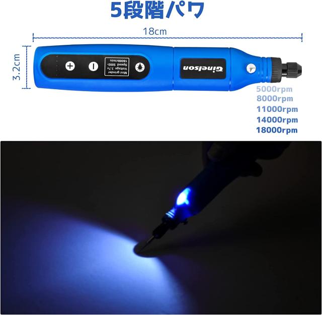 Ginelson ミニルーター 5段変速 64PCS 18000RPM高速回転 照明ライト TYPE-C充電式 コードレス コンパクト 軽量 彫刻/穴あけ/研磨/切断/切削/つや出し/マニキュア/汚れ落とし 軽作業に向け 日本語取扱説明書付き