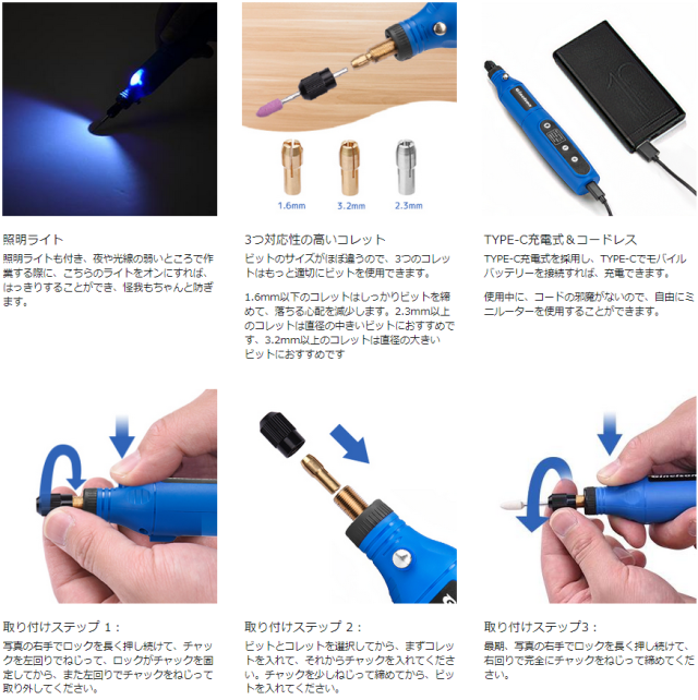 Ginelsonこのミニルーターには、1.6ミリメートルと2.3ミリメートル×2の計3つの異なるコレットが付属しています、より多くのビットを正しく取り付けられます。他社ビットの直径が本製品のコレットに相応しければ、使用できます、より幅広くビットを選択できます。