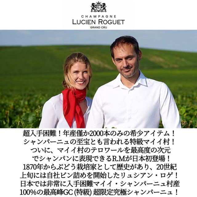 超入手困難!年産僅か2000本のみの希少アイテム!シャンパーニュの至宝とも言われる特級マイイ村! ついに、マイイ村のテロワールを最高度の次元 でシャンパンに表現できるR.Mが日本初登場!1870年からぶどう栽培家として歴史があり、20世紀上旬には自社ビン詰めを開始したリュシアン・ロゲ!日本では非常に入手困難マイイ・シャンパーニュ村産100%の最高峰GC (特級) 超限定究極シャンパーニュ!