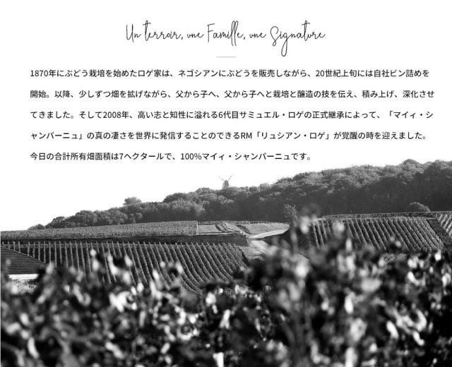 1870年にぶどう栽培を始めたロゲ家は、ネゴシアンにぶどうを販売しながら、20世紀上旬には自社ビン詰めを開始。以降、少しずつ畑を拡げながら、父から子へ、父から子へと栽培と醸造の技を伝え、積み上げ、深化させてきました。そして2008年、高い志と知性に溢れる6代目サミュエル・ロゲの正式継承によって、「マイィ・シャンパーニュ」の真の凄さを世界に発信することのできるRM「リュシアン・ロゲ」が覚醒の時を迎えました。今日の合計所有畑面積は7ヘクタールで、100%マイィ・シャンパーニュです。