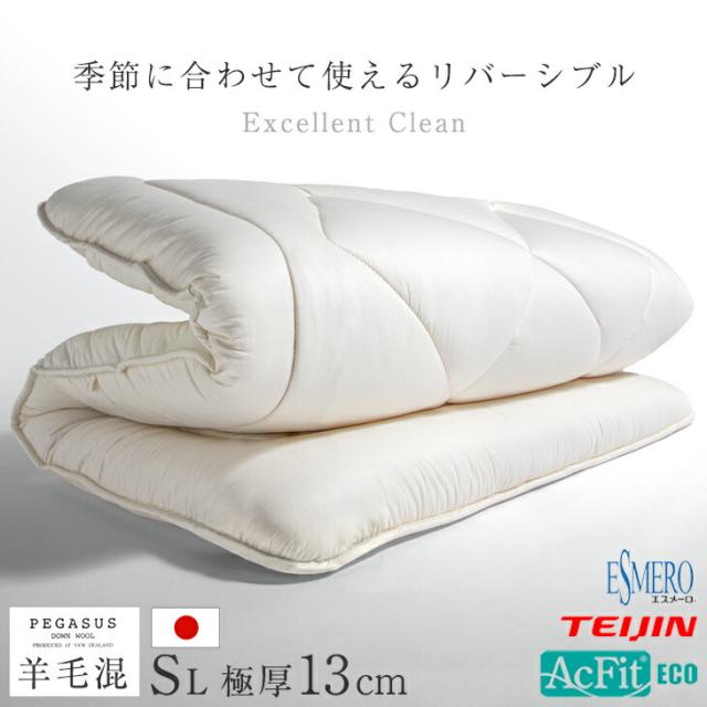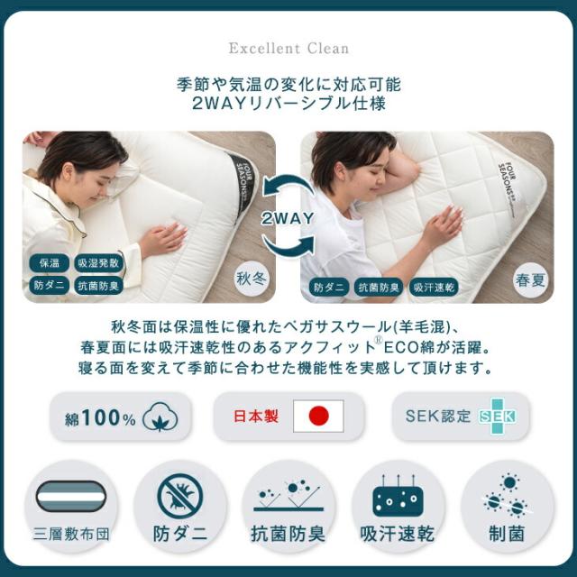 季節に合わせてリバーシブル ペガサスウール 極厚13cm 敷布団 シングル ロング 制菌 日本製 防ダニ 抗菌防臭 吸汗速乾 敷き布団 ウール 羊毛混 マットレス不要 清潔 三層敷布団 国産 マットレス 硬め 軽量 極厚 敷ふとん