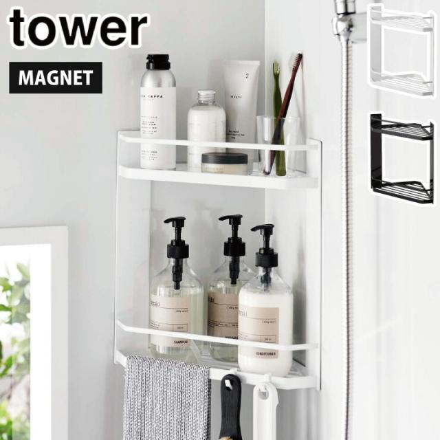 タワー マグネットバスルームコーナーラック 2段 山崎実業 ホワイト 6623 ブラック 6624 yamazaki tower【 バスラック コーナーラック マグネット収納 フック バスルーム お風呂 小物収納 浴室収納 タワーシリーズ 】