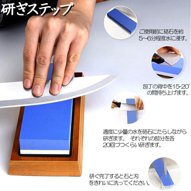 【両面砥石】砥石に書いてある「#1000」や「#6000」などが粒度になります。「#1000」を「中砥石」、「#6000」を「仕上げ砥石」と呼びます。通常包丁を研ぐ時は中砥石と仕上げ砥石最低でも2種類の砥石が必要です。両面砥石は中砥石(#1000)と仕上砥石(#6000)が一緒になった優れた砥石です。中砥石は切れ味が悪くなった時に使います。一般のご家族なら中砥石があれば十分です。仕上砥石はより良い切れ味を追求したい時に使います。砥石にさまざまな粒度があるのは、包丁の状態によって使い分けた方が効率がいいからです。【滑り止めゴム付き竹製台】竹製台がついている砥石です。高さがあるので研ぐ時に手にぶつかりません。また、砥石が薄くなっても台についているので割れ にくくなっています。砥石を載せるとしっかり固定されるようになっています。竹製台には滑り止めゴムが付いており、しっかり固定して作業が出来ます。