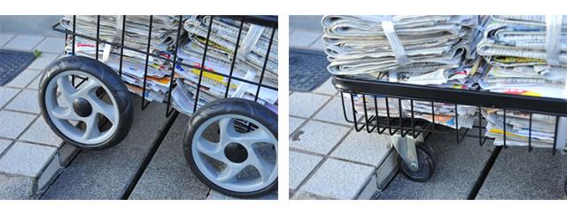 ・台車のバスケットは深さがあるので、段差でも荷崩れしにくいです。