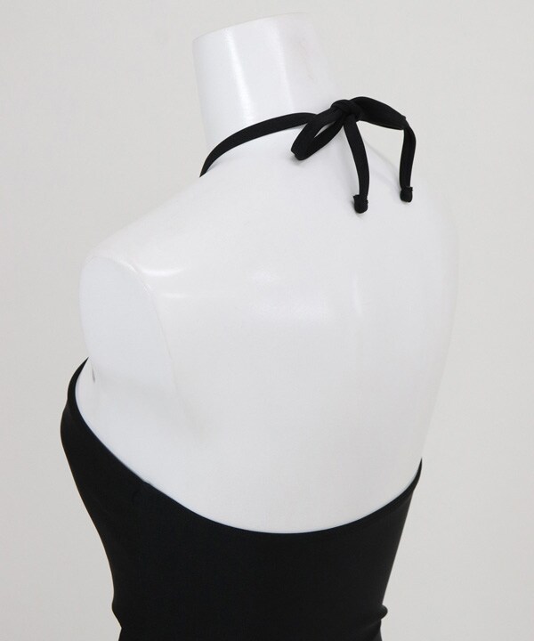 華奢なストラップのホルターネックは全体をすっきり見せ、大きく開いた背中でヘルシーなバックスタイルをアピール。