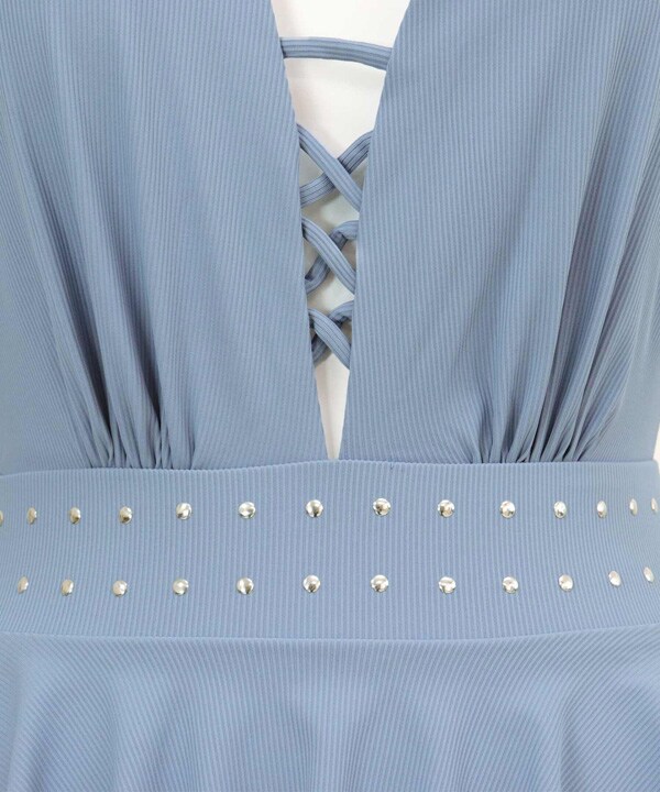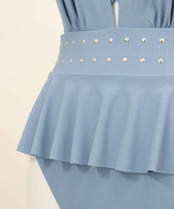 軽くて丸いスタッズの付いたウエストは、ベルトのように全体を引き締めて演出。