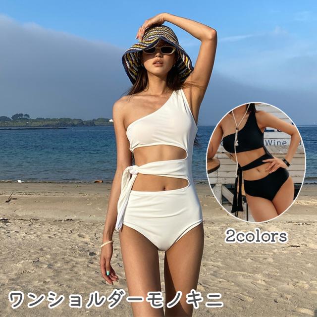 水着 モノキニ ワンピース レディース ワンショルダー カットアウト ウエストリボン パッド取り外し可能 無地 シンプル セクシ