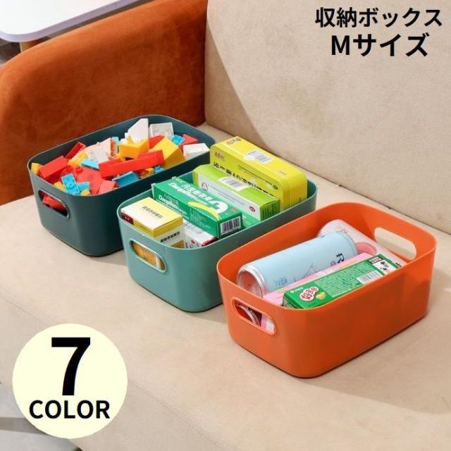 プラスチック製の持ち手付き収納かごMサイズです。