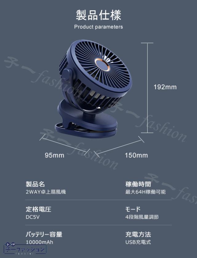 | ◆製品名:2WAY卓上扇風機 ◆カラー:ネイビー グリーン ホワイト ブラック ◆サイズ:約150×95×192mm ◆定格電圧:DC5V ◆パッケージ内容:扇風機本体×1、USBケーブル×1 ◆素材:ABS ◆バッテリー仕様:4節バッテリー、共に10000mAh ◆輸入国:中国(製品) ■ご使用可能時間:フルー充電後、微風モードの場合、最大5.8H稼働可能 ■720°角度調節:手動で上下左右に風向きを調節できるので、どの角度からも涼しい風が楽しめます! ■風量4段階調節:風量が微風、弱風、中風、強風の4段階で切り替え可能、お好みに合わせて自由に風量の調節ができます。自然の風に近く赤ちゃんや子供にもやさしいし、強い風で空気を循環させて卓上全体を冷やす。 ■クリップ式&卓上両用:クリップ式で様々なところに挟んで使用が可能です!クリップの底面部には、台座として使えるように滑り止めが付いており、卓上に置いても使用が可能です!テーブル、デスク、リュック、車内、オフィスなどに適用しています。 ■静音設計:低騒音設計なので、静かな環境を作り、睡眠中や作業中おとが気にならず。 |