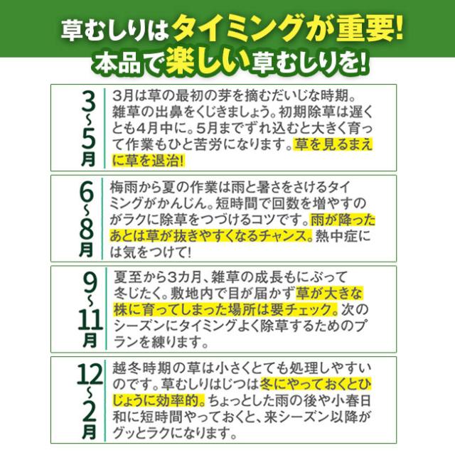 約2300回の高速振動で頑固な雑草を根元からラクに抜き取ります。カマでの雑草刈りは表面しか刈れない上に、時間がかかり疲れてしまいますが、根こそぎ除草バイブレーターを使用すると短時間でラクに根本から除草できます。草の根本に当てると、高速振動が根っこについている土をほぐしてくれるから、力はほどんど不要で楽に除草できます。