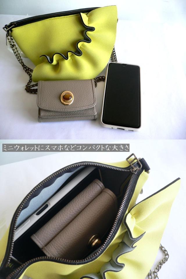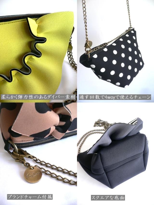 RAPTURE ラプチャー バッグ マイクロボンボンネイプルズ2ウェイチェーンバッグ ダイバー素材 フリルバッグ PO460 イエロー/パープル/グレー/ブラック/ボーダー/豹柄/レオパード/メタリック/ゴールド/シルバー