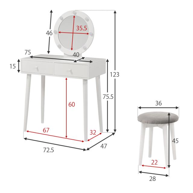 ■サイズ:ドレッサー:(約)幅75×奥行47×高さ123×天板高75.5cm、スツール:(約)幅36×奥行36×高さ45cm