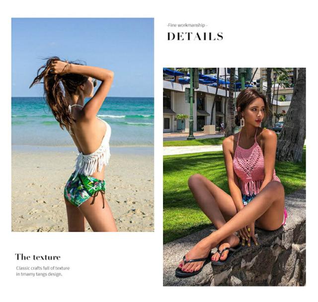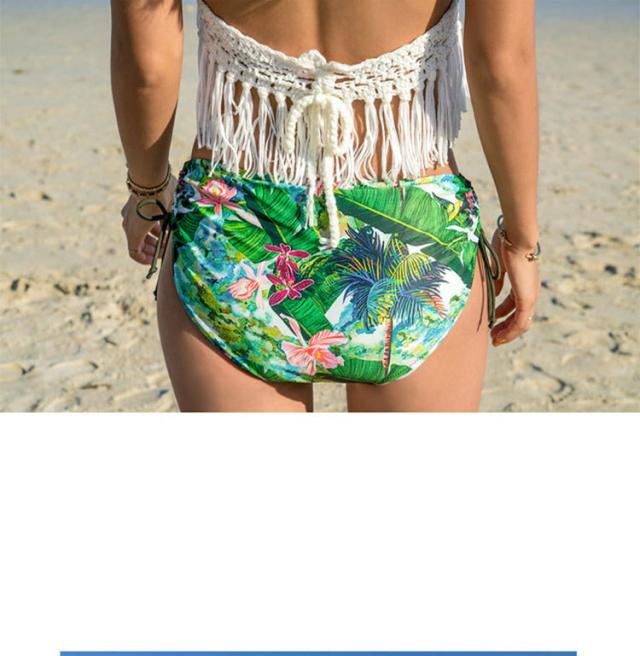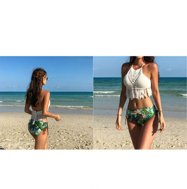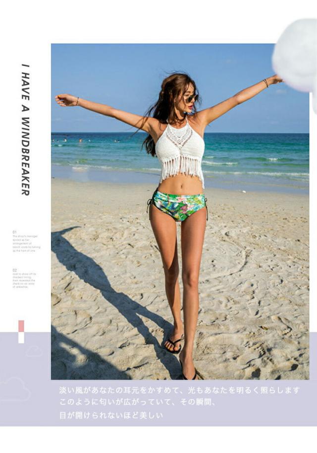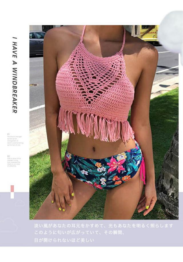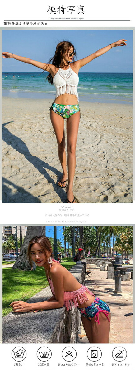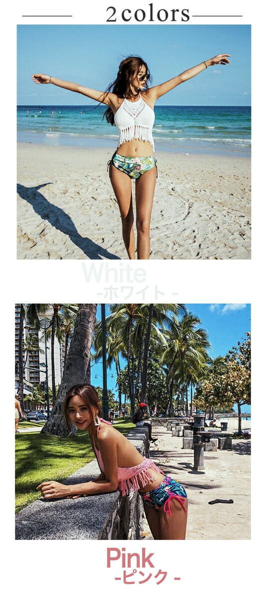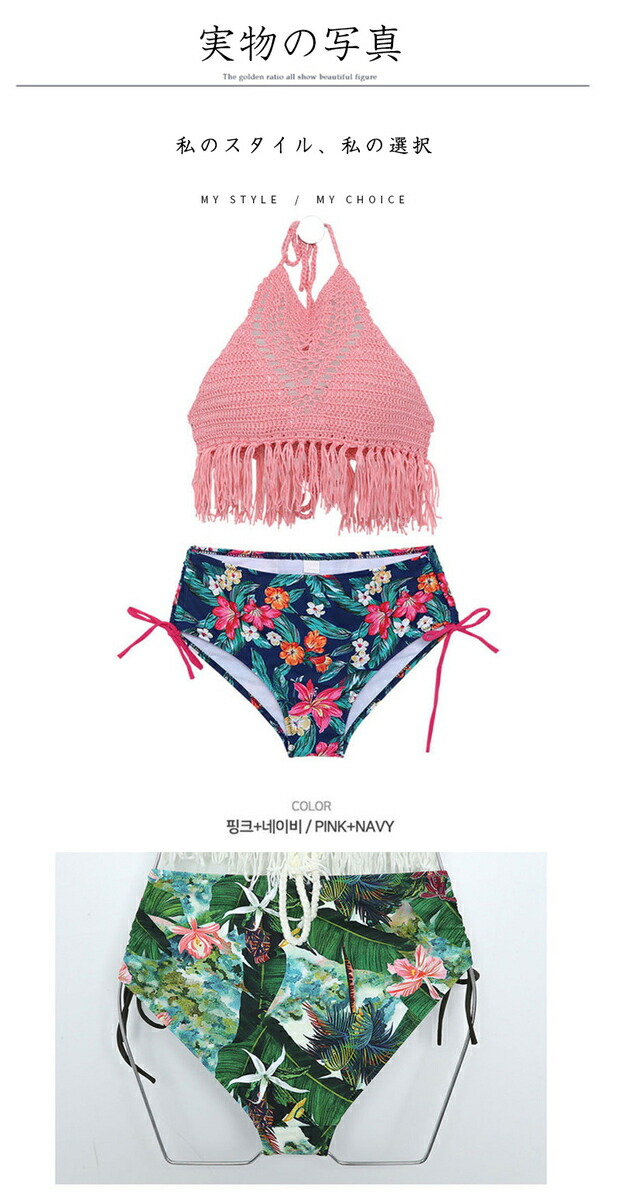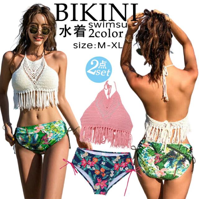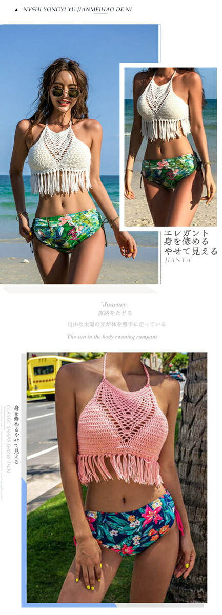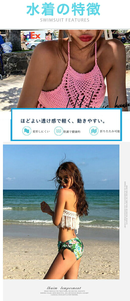 水着 レディース ビキニ 上下2点セット ノンワイヤー パット入り ベージュ ブルー系 三角ブラ クロシェニット ハイライズ エスニック柄 花柄リボン バックシャン 可愛い ヘルシー 海 プール