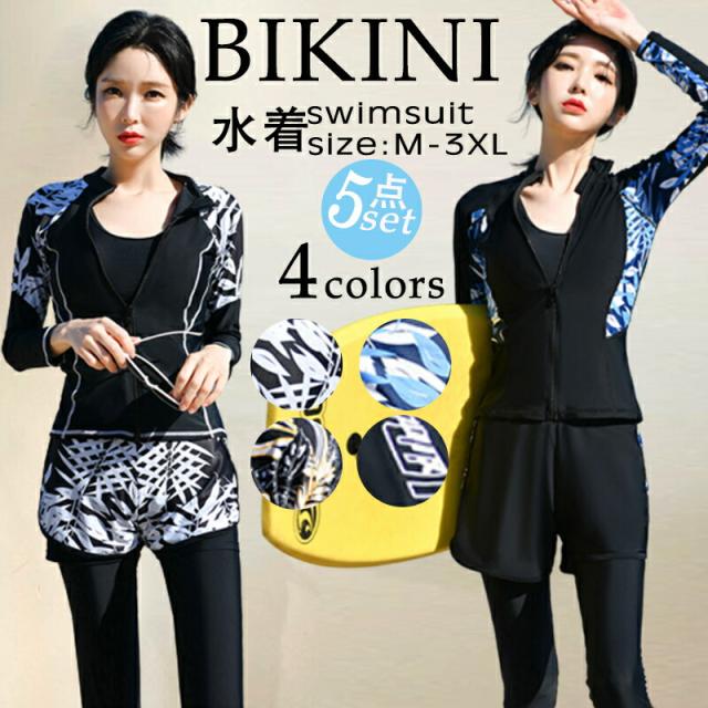 体型カバー 水着 レディース 長袖ラッシュガード 5点上下セット 体型カバー 可愛い フリル 水着 韓国 水着 タンキニ 水着 タンキニ 露出控えめ セパレート スカート 可愛い水着 安全パンツ 学生 レディース スイムウェア 大人 水着 女性 リゾート 水泳