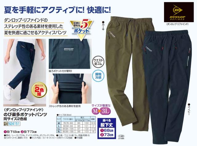 ダンロップ・リファインド のび楽多ポケットパンツ 2色組 イージーパンツ ストレッチパンツ メンズ 紳士服 シニア 男性 カーキ ネイビー 接触冷感 ウエストゴム 緑 紺色 シンプル 40代 50代 60代 70代 80代 父の日 お父さん