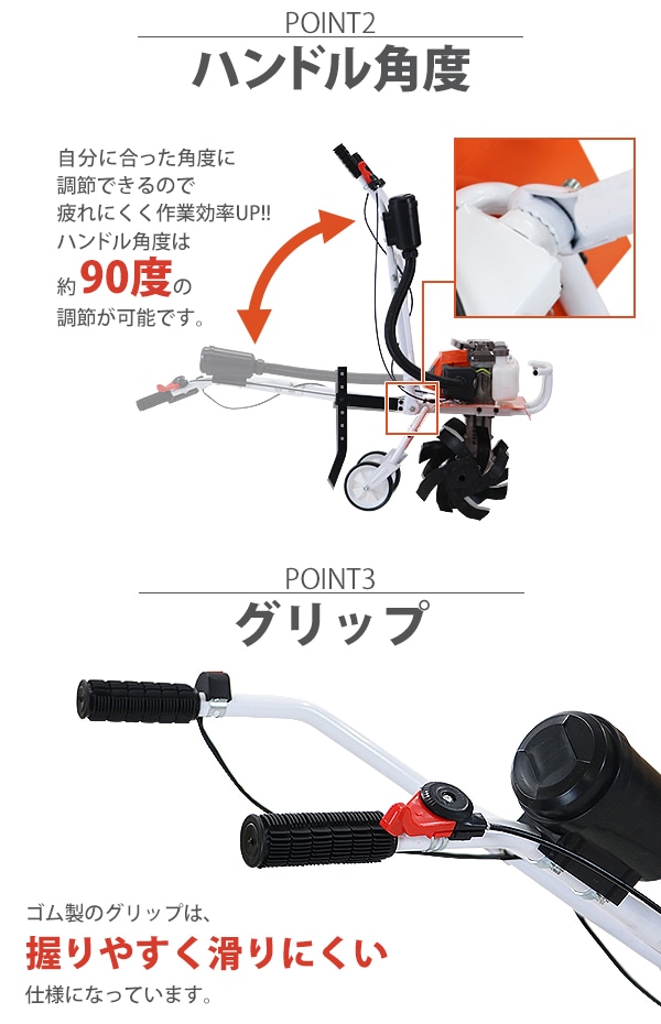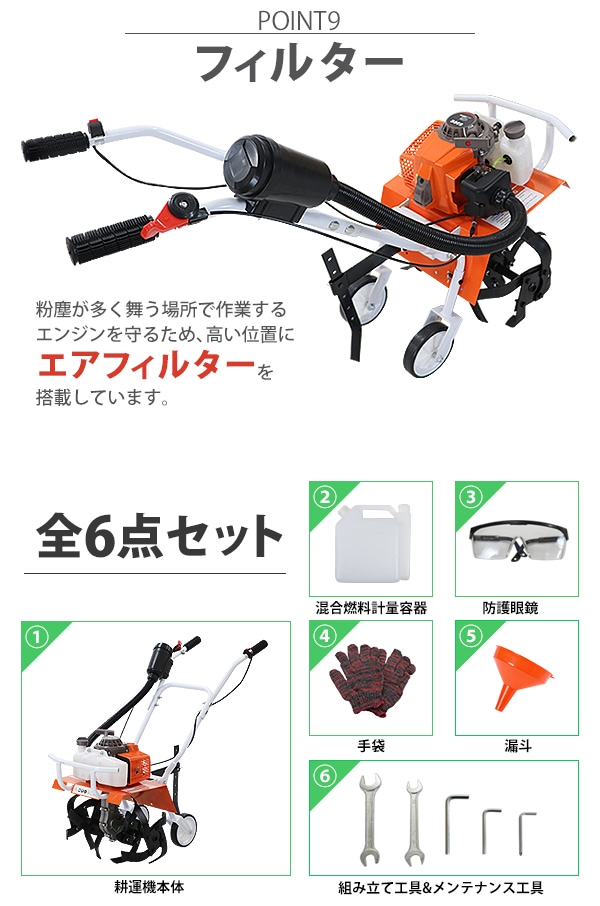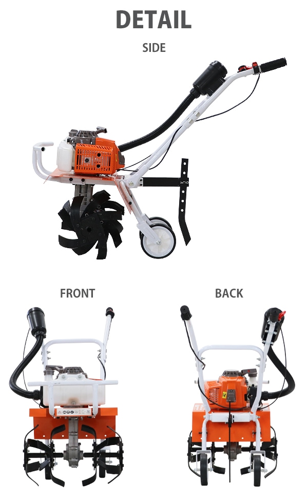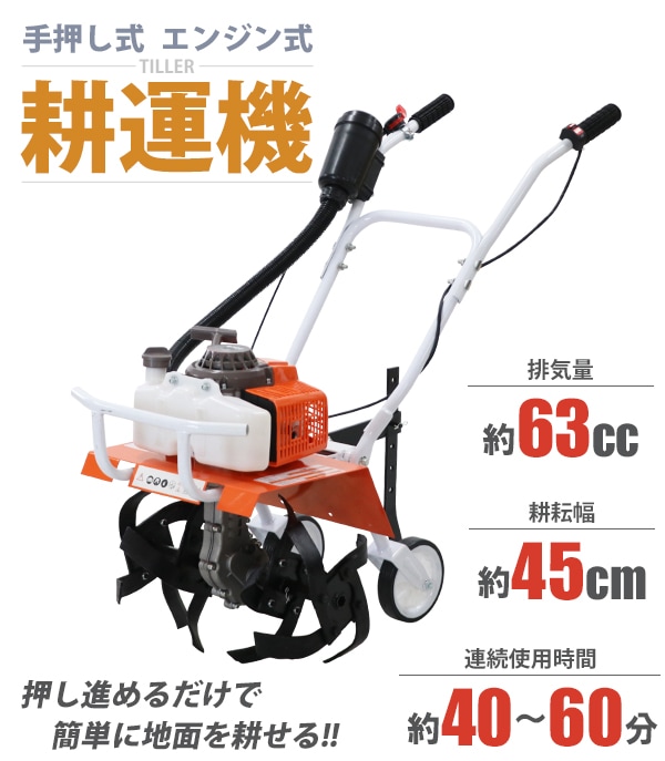 耕運機 手押し式 エンジン式 排気量約63cc 耕幅約45cm 約450mm 2サイクル エンジン 軽量 コンパクト 耕す 農耕 耕うん 耕うん機 小型 家庭用 家庭菜園 農業用品 農業機械 溝切り 草削り 土ほぐし ガーデン ガーデニング 園芸 農業 畑 庭 tillertt63