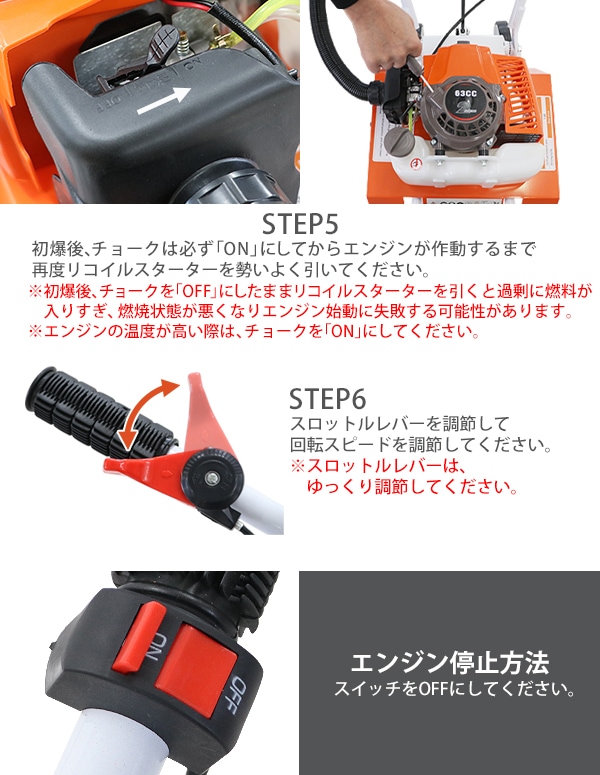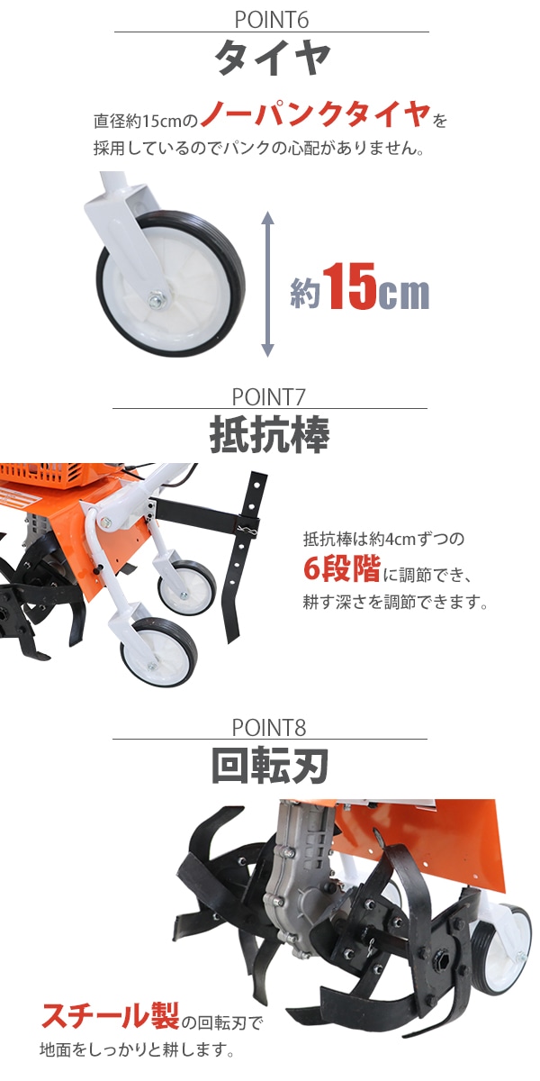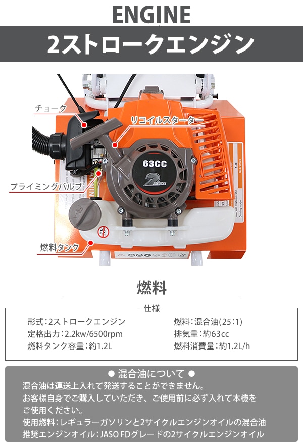 ■押し進めるだけで簡単に地面を耕せる耕運機です。 ■エンジン式なので電源のないところでも使用できます。 ■ハンドル角度は約90度の調節が可能です。 ■ゴム製のグリップは握りやすく滑りにくい仕様になっています。 ■エンジンを掛けてスロットルレバーを調節して押すだけの簡単操作! ※エンジン始動時にはスロットルレバーがLに振り切っていることを確認してください。始動時に勝手に進みだす恐れがあります。 ■本体重量は約24kgと軽量設計なので扱いやすいです。 ■約15cmのノーパンクタイヤを採用しているのでパンクの心配がありません。 ■抵抗棒を使用することで耕す深さを調節できます。 ■抵抗棒は約4cmずつの6段階に調節できます。 ■スチール製の回転刃で地面をしっかりと耕します。 ※こちらの商品は組み立て式です。 (組立用の工具は付属しています。) ■本体重量:約24kg ■耕幅:約45cm ■タイヤサイズ:約15cm ■手押し式 「エンジン」 ■2サイクルエンジン ■エンジン出力:2.2kw/6500rpm ■回転数(作業時):6500rpm/分 ■排気量:約63cc ■始動方法:リコイルスターター ■使用燃料:混合油(レギュラーガソリン、2サイクルエンジンオイル) ※混合油は25(レギュラーガソリン):1(2サイクルエンジンオイル)で作成してください。 ■推奨エンジンオイル:JASO FBグレードの2サイクルエンジンオイル ■燃料タンク容量:約1.2L ■燃料消費量:約1.2L/h ■燃料満タン時連続使用時間:約40〜60分 ※燃料の補充は、必ずエンジンを停止させてから行ってください。 ■騒音値:約105dB ■材質:スチール(フレーム、回転刃)、プラスチック(スロットレバー)、ゴム(タイヤ、グリップ) ■付属品:日本語説明書、混合燃料計量容器、防護眼鏡、手袋、漏斗、組み立て工具、メンテナンス工具 ★1階車上でのお渡しとなります。恐れ入りますが荷降ろし・搬入は、お客様にてお願い致します。 ●新品商品ではありますが、輸入商品の為、多少の擦り傷などがある場合がございますので、ご納得の上ご購入下さいませ。 ●ご購入後、お客様ご都合によるご返品、ご返金等は一切お受け致しておりません。 ●本商品を使用した際に発生したトラブル、事故につきまして、当社は一切の責任を負いません。ご使用に関しましては、全て自己責任にてお願い致します。 |