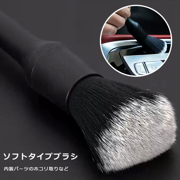高品質樹脂を使用したソフトタイプのブラシは、ダイヤルのすき間やメーター周り、内装パーツのホコリ取りに適しています。一番柔らかいブラシなので、エンブレム周りなど外装にも使えます。