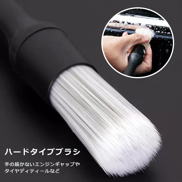 PPワイヤーを使用したハードタイプのブラシは、手の届かないエンジンギャップやタイヤディティールなどの汚れを落とすのに適しています。ホイール洗いやエンジンルームの汚れもキレイに落とせます。