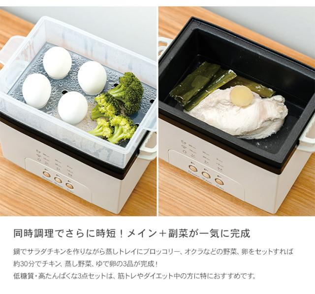鍋でサラダチキン、付属の蒸しトレイでゆで卵や蒸し野菜が調理できます。