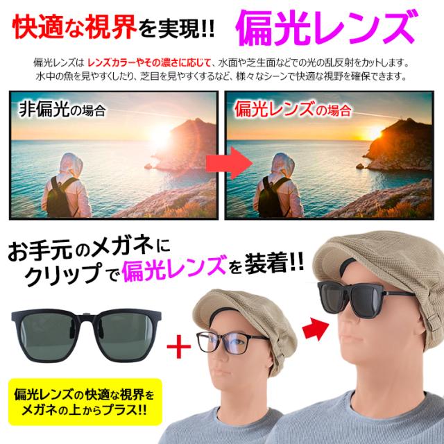 | 商品詳細 サングラス メガネの上から クリップサングラス 【804p】 お使いのメガネの上から、ワンタッチで簡単装着可能。 クリップオン、跳ね上げタイプの偏光サングラスです! ※イエロー偏光、カーキイエローグラデーション偏光、ライムイエロー調光偏光の3カラーはレンズカラーが明るいため、偏光機能がかなり弱くなっております。 【対応メガネ幅】フレーム、レンズの厚み約7mmまで。 気になる紫外線(UV)から目や肌をしっかりと守ります。 有害な紫外線(UV400)も99%以上カット。 【偏光機能】 車の運転、ドライブ中のフロントガラスの映り込みや路面の日差しの照り返しをカットし、フィッシング・釣りで、水面からのギラつきを抑え、水中の様子を見やすくするのが偏光機能! 野球、ゴルフ、テニス、サイクリング、ランニング、ウォーキング、 ウインタースポーツなど様々なスポーツの他、レジャー、アウトドア、 釣り、登山、ドライブやタウンユースなど、さまざまなシチュエーションで、日差しや眩しさを抑えて、目に優しいクリアな視界を確保します。 ファッションアイテムとしてもピッタリです。 ケースがついているので、持ち運びにも便利です。 ギフトやプレゼントとしても最適です。ラッピングも無料対応中です。 | |